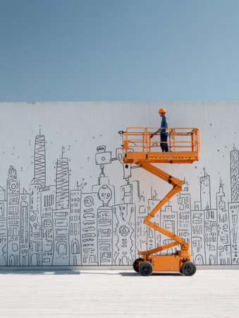 A worker operates a lift to create a detailed mural of a city skyline on a large wall under clear blue skies.