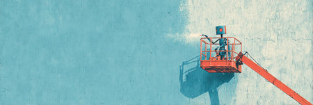 A worker is elevated in a lift, applying spray paint to a large wall in an urban area under bright sunlight, showing vibrant colors.