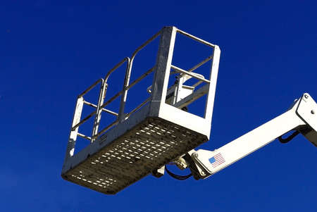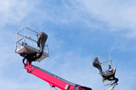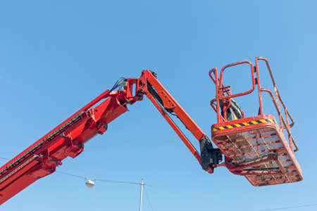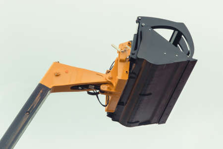 Cherry picker on blue sky background. Boom with lift bucket of heavy machinery. Platform of the telescopic construction lift close-up.