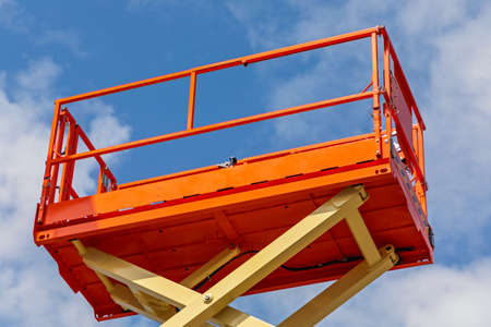 Scissor lift platform with hydraulic system at maximum height range painted in orange and beige colors, large construction machine, heavy industry, white clouds and blue sky on background