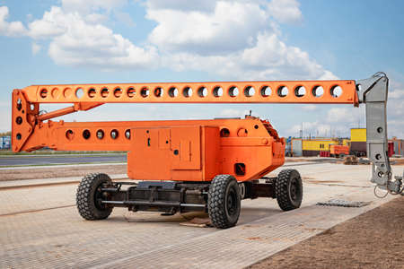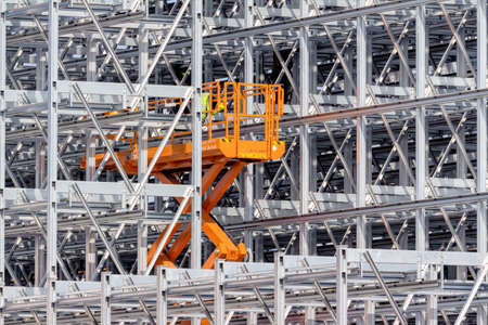 Basket lift, orange lifting platform on construction site. Industrial machine, work on height equipment concept.