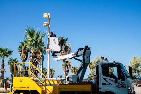Tel Aviv Israel September 19, 2019 View of technicians from the electricity company working in the streets of Tel Aviv in the afternoon