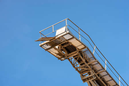 Conveyor belt for gravel against the blue sky at an industrial cement plant.
