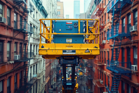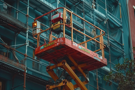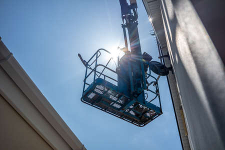 Milan italy 8 September 2020: Construction worker on a boom lift on the side of a building