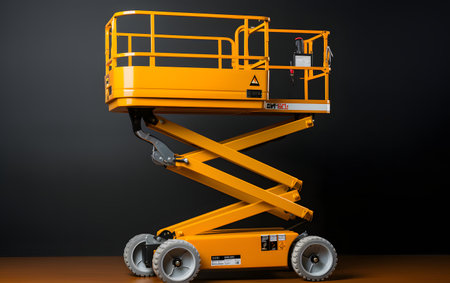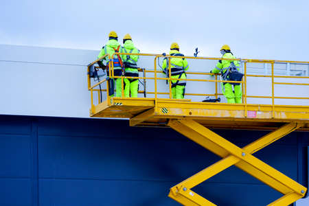 yellow self propelled scissor lift with workers in uniform and safety protective equipment against a blue sandwich panel wall background