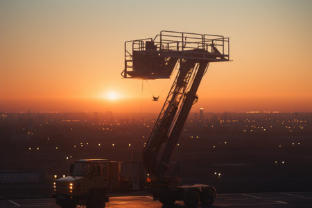 high long industrial crane arm with cradle on dark blue sky with clouds. abstract magic light concept