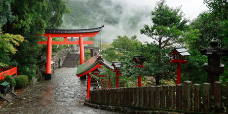 view of Japanese temple and torii gate in misty mountains