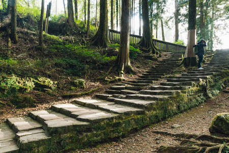 Tourist standing on stone stair and shooting a view of Cedar trees with moss in the forest