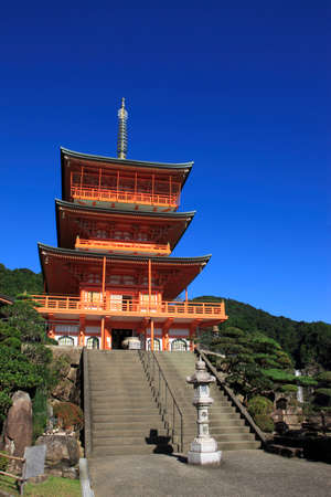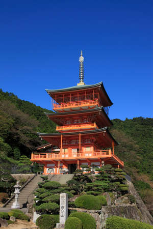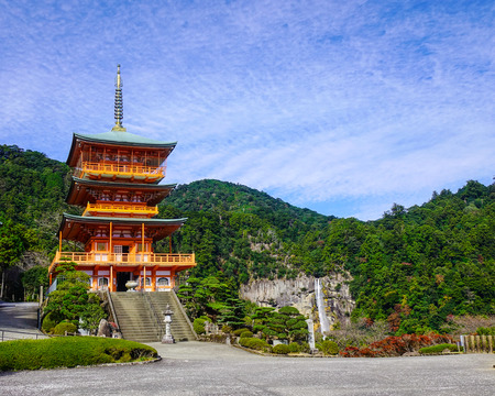 Three story pagoda of Seiganto-ji Tendai Buddhist temple in Wakayama Prefecture, Japan with Nachi Falls in the background