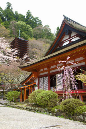 cherry blossoms (Sakura) with a traditional Japanese building in the background in Kiyomizu Dera Temple