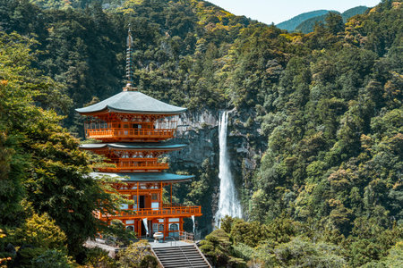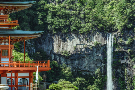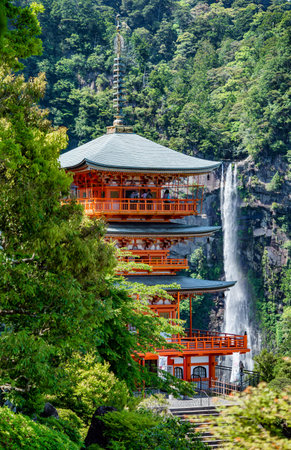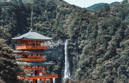 The red three-story pagoda of Seigantoji Buddhist Temple in front of Nachi Falls. Beautiful natural scenery in Nachikatsuura, Japan