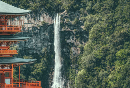 Close-up of Seigantoji Shrine and Nachi no Taki (waterfall) in Wakayama, Japan.
