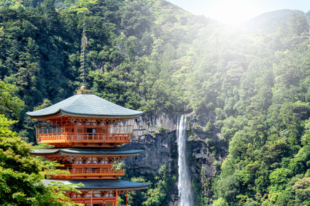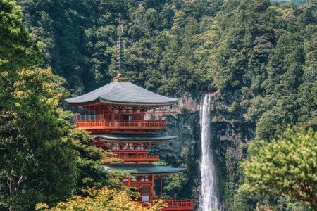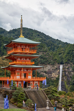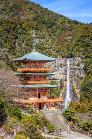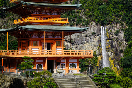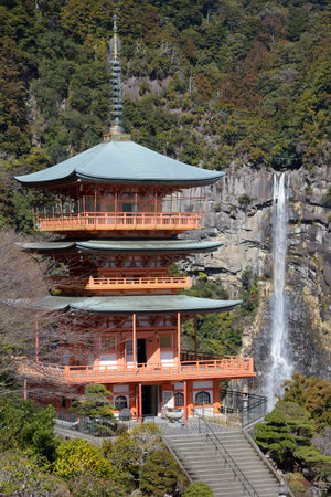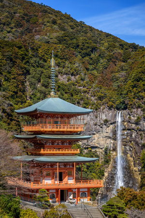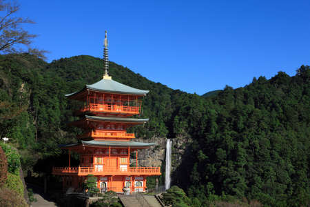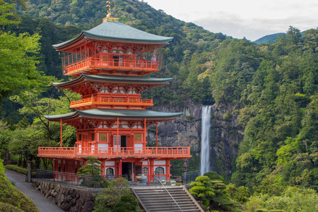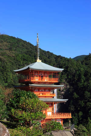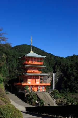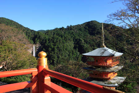 Three story pagoda of Seiganto-ji Tendai Buddhist temple in Wakayama Prefecture, Japan with Nachi Falls in the background