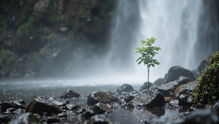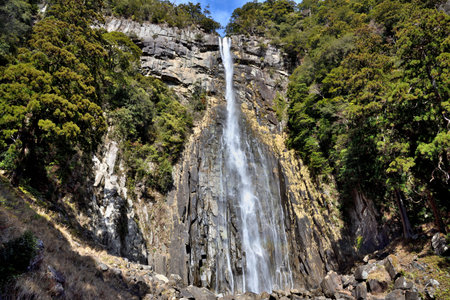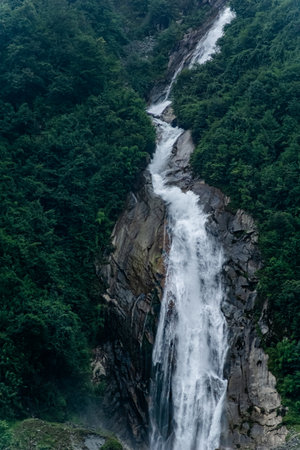 waterfall in deep forest falling from a high rocky cliff Himalaya, India, Uttarakhand