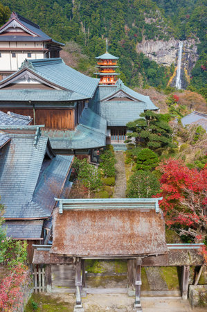 SHINGU, JAPAN - OCTOBER 27, 2007: The view of the three story Pagoda of Seigantoji Temple with the Nachi fall on the background. Wakayama Prefecture, Japan.