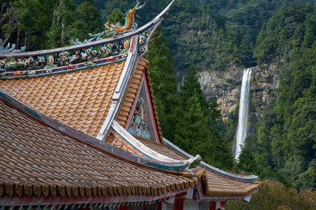 The curved roofs decorated with ornamental dragons at the abandoned colorful Chinese temple with the Nachi waterfalls on the background. Wakayama prefecture. Japan