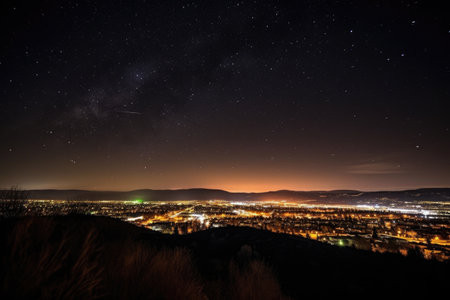 shot of a beautiful night sky with city lights in the distance, created with generative ai