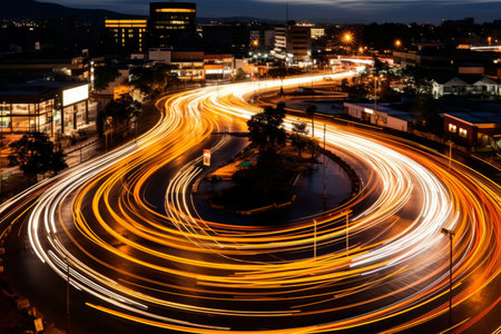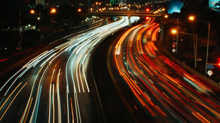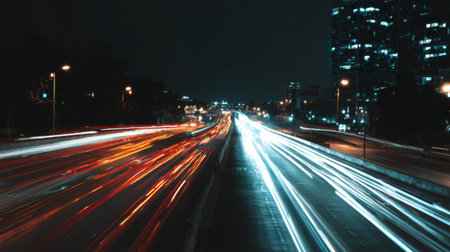A captivating view of city traffic at night showcasing dynamic light trails from moving cars, illuminating the urban landscape with vibrant colors and energy.