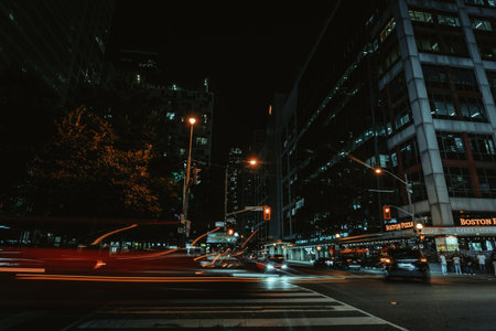 A breathtaking nighttime view of a modern city showcasing vibrant light trails from traffic, illuminated buildings, and a bustling urban atmosphere.