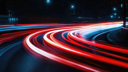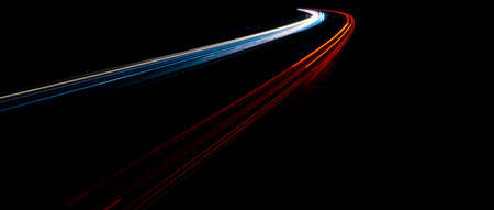 Sleek light trails of a speeding car captured at night, forming glowing lines of red and white across a dark, city street