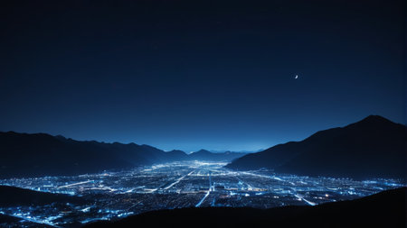 Majestic deep indigo night sky filled with tiny stars and a waxing crescent moon, casting light upon the atmospheric purple glow generated by the bright metropolitan area lights below.