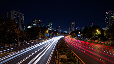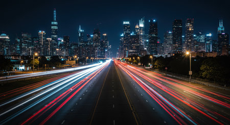 Vibrant light trails streaking through cityscape at night