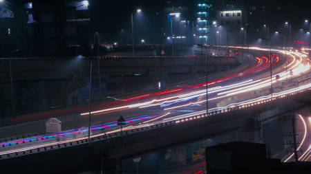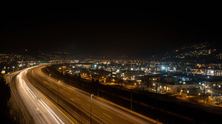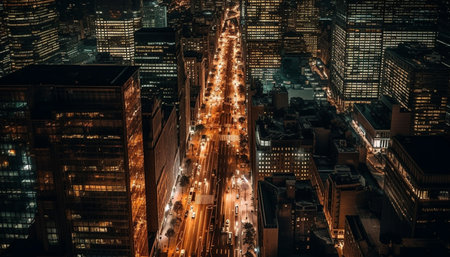 Aerial night cityscape capturing dynamic traffic motion in mesmerizing timelapse.