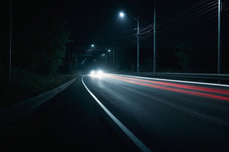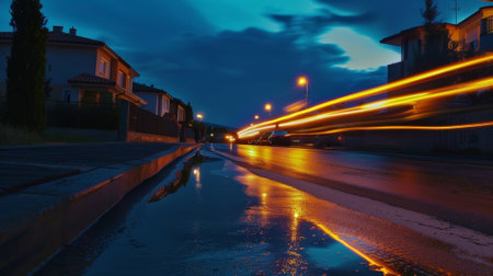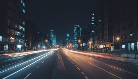 Low angle street view at night with long light trails long exposure created with generative AI technology