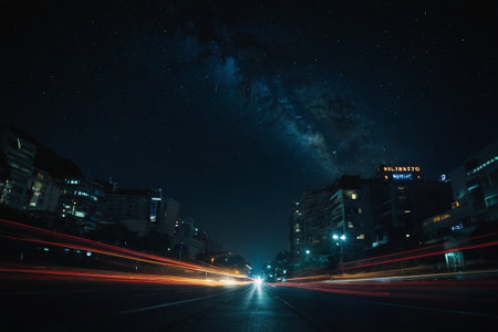 Night cityscape with starry sky and milky way over the city