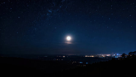 Deep navy blue starry sky contrasting dramatically with the bright full moon, hovering over a low horizon line where warm orange and white city lights glitter below dark, silhouetted hills.