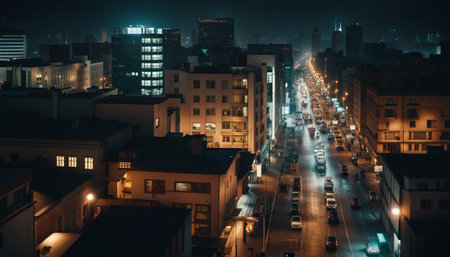 nighttime cityscape, with colorful lights shining and illuminating the streets, created with generative ai