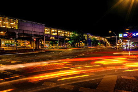 Berlin; Germany - June 23; 2021: Night shot of ghosting effects due to the long exposure time on a busy intersection in downtown Berlin in front of an illuminated train station.
