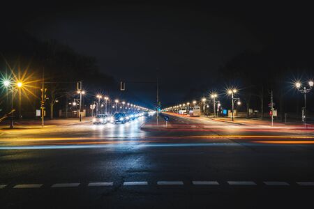 Long city road with light trails at night. Long exposure photo of straight wide road in Berlin