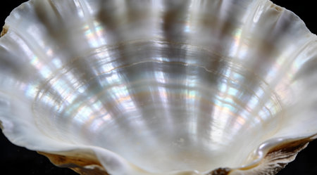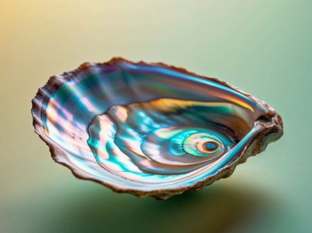 Close up of an opened oyster shell revealing its shimmering, iridescent nacre with a spectrum of vibrant colors. natural beauty and delicate texture.