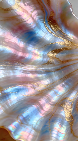 A creative digital illustration depicting Professional digital art of mother-of-pearl iridescent surface, swirling colors and glossy sheen, soft pearlescent lighting, exotic opulence mood, detailed commercial style. This AI-generated artwork features unique visual elements suitable for various commercial and editorial applications. AI-generated illustration.