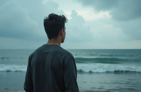 AI Generative man stands on the shore and looks into the distance at the water. Against the background of the mountain