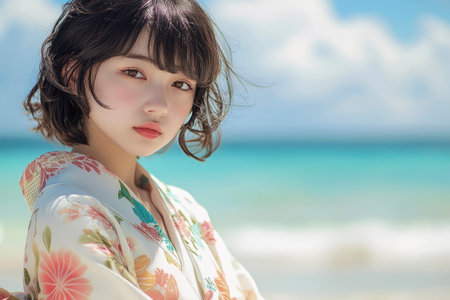 Japanese woman wearing traditional floral kimono posing on a tropical beach with turquoise water
