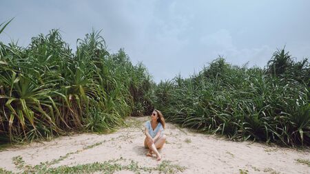 Young woman in casual style fashion lying on the beach. Relaxing and enjoy holiday at tropical paradise beach. Girl in summer vacation. Summer vibes.