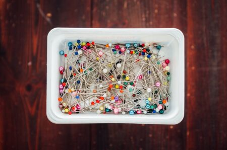 Close up of different coloured pins on a light background. Shallow depth of field. Retro filter applied.