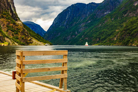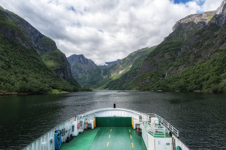Mountains landscape and ferry boat on fjord Sognefjord in Gudvangen Norway Scandinavia. Tourism vacation and travel