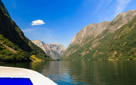 A view on the Songefjorden (King of the Fjords) from the water level. It is the deepest fjord in Norway. Tall, lush green mountains surrounding the fjord. Calm surface of the water. Clear blue sky.