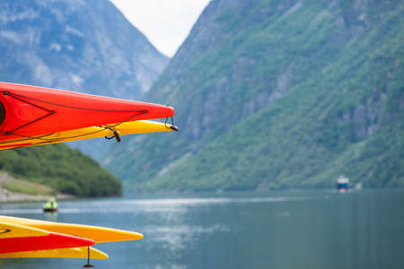 Active lifestyle sport concept. Many canoes outdoor in rental center, norwegian fjord landscape in the background