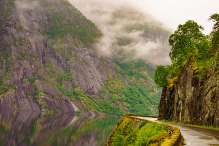 Norwegian landscape. Old road along fjord Eidfjorden in Norway Hordaland. Foggy rainy weather.