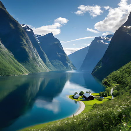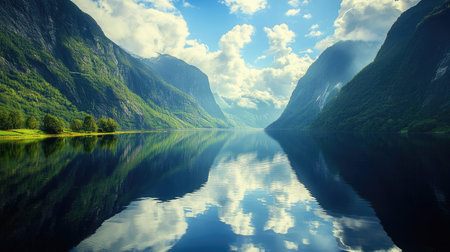 Majestic mountains and green trees reflecting in a calm fjord under a blue sky with clouds