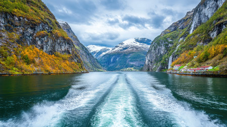 Stunning fjord landscape showcasing clear waters surrounded by majestic mountains and vibrant autumn foliage. A perfect nature escape.