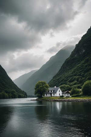 Captivating view of a tranquil fjord surrounded by majestic mountains and lush greenery, creating a serene atmosphere with mist and soft clouds.