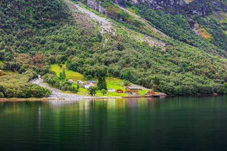 Scandinavian homes houses on shore of the narrowest fjord in Norway - Naeroyfjord.