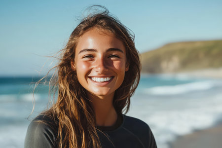 Woman enjoying a beautiful beach moment, smiling widely as sunlight highlights her joyful expression and glistens on her skin during sunset.