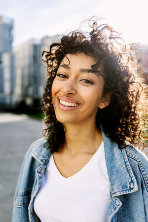 Joyful young woman with a radiant smile enjoys a sunny day, exuding happiness and vitality