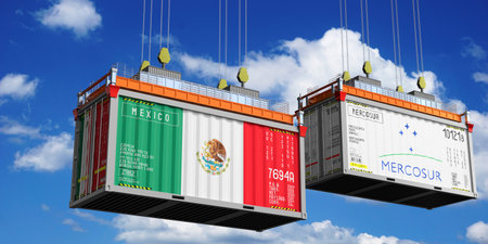 Shipping containers with flags of Mexico and Mercosur - 3D illustration